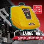 An integrated sprinkler system connected to a large 14L water tank ensures the base plate is kept cool and asphalt adhesion is minimised. Operator comfort is assured by the oversized shock-absorption system integrated into the handles. Unlike other models on the market, transport from job-to-job is no fuss thanks to the retractable wheels, and there is also a lifting hook incorporated into the frame.
