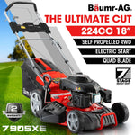 The self-propelled Baumr-AG 790SXe lawn mower offers powerful, easy mowing with its 18" cutting width and big 224cc 4-stroke engine delivering a massive 6.0 horsepower. The electric start, powered by a 20V Li-ion battery, lets you begin with a button push. Built with a tough steel deck, all-terrain wheels and self-propelled design, it navigates smoothly over any surface, especially on large or sloping blocks.