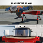 Support arms on either end of the sawhorses can hold 2 x 4’s in a horizontal position to form an ultra-sturdy jobsite table, and a non-slip surface on the top offers peace of mind. You can also pass 2 x 4’s through the support arms so that you can hold awkward material such as PVC pipes.