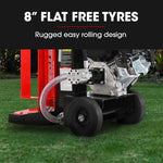 Features 8" flat-free tyres and a one-hand operating lever for smooth transport and operation. Whether you're splitting by the shed or in the paddock, this unit moves easily and handles tough terrain.