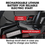 - Electric Start comes with a rechargeable 20V Lithium battery for reliable starting every time