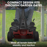 With a compact design that can easily fit through a standard gate and a turning circle of 2.9m, this small sit on lawn mower is agile and navigates tight corners with ease. The 10" front wheels and 13" rear wheels provide a comfortable and manoeuvrable experience. The bagging handle on top, and a nylon grass collection box make maintenance and cleanup a breeze.