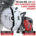 The CSP-800 Handheld Pro Concrete Saw is your go-to tool for unmatched cutting power and versatility. Designed for professionals, this lightweight robust saw is built to tackle the toughest materials, including masonry, concrete, and stone. Powered by a 74cc 2-stroke petrol engine, the CSP-800 Pro generates 4.8HP (3.5KW) making quick work of demanding cuts.
