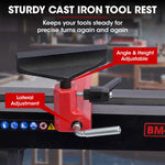- Cast iron tool rest and foot stock for durability and stability