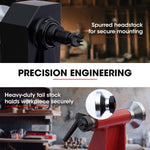 The nose shaft features an 18mm flared end with a 1mm centre taper to prevent slipping and assure mounting accuracy. The drive shaft can also be removed and fitted with a drill chuck*. The headstock and foot stock have sealed bearings to prevent dust contamination.
