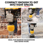 This remarkable rammer combines agility and power. The heavy-duty unit weighs in at 81kg, and can effortlessly leap up to 65mm! With an output of 10kN you’ll power through the toughest tasks - packing asphalt, aggregate, sand and soil with ease! The compact design makes it ideal for tight-to-fit areas like trenches, narrow excavations and working around pillars and pipes.