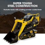 Reinforced rubber tracks with steel wire cores grip well over dirt, gravel or slopes up to 25. A steel frame with industrial powder coating resists rust, while premium HRB bearings and HRB drivetrain components enhance durability across the board.