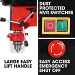 The DP15 pedestal drill has been designed with smooth, powerful and consistent drilling in front of mind. Its 60mm depth adjustable drill travel is accompanied by a sturdy cast iron work table, accommodating the various types of objects to be drilled and the precision required. Moreover, the work table is also angle adjustable up to 45° in either direction. The large three spoke handle works in harmony with the rack and pinion spindle feed to produce a clean and fluid press. The chuck guard can be extended downwards to offer optimal user protection and can be easily retracted for quick drill bit changes. The DP15 has a large easy access emergency shut-off button, It also comes fitted with dust protected NVR switches, so no restart will occur once power is restored in the event of an outage.