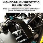 The 10HP engine is partnered with an automatic hydrostatic transmission offering 2 speeds forward and reverse. A maximum speed of 5kmh in forward and reverse assures quick safe transport while the variable speed maintains maximum control. With full loads of up to 500kg, this torquey machine moves across your worksite or property quickly and efficiently. The secure parking brake is lever controlled for ease and reliability.